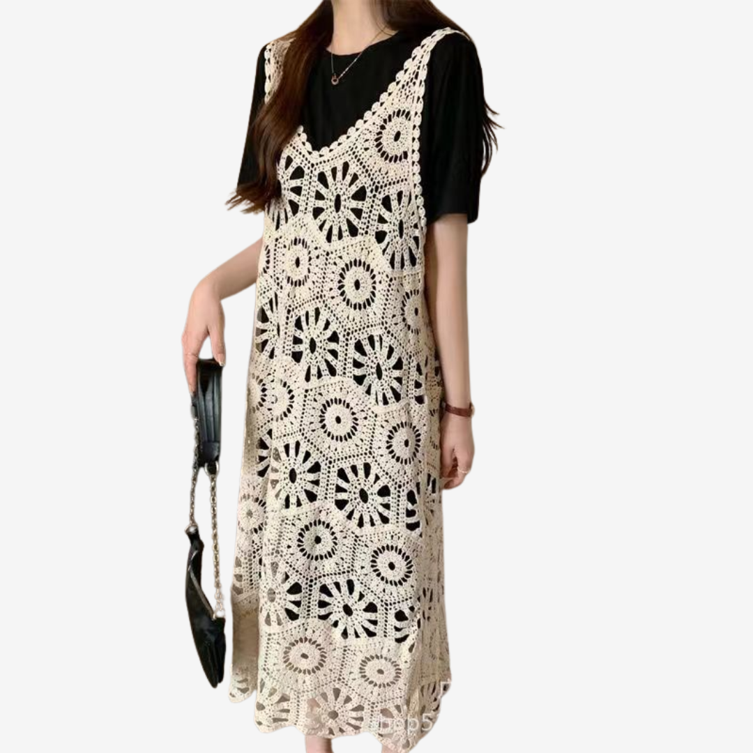 Sublimez votre garde-robe estivale avec la Célista™, une robe en maille sans manches à l'allure bohème chic et aérienne, idéale pour les journées à la plage ou les dîners au coucher du soleil. Confectionnée en coton mélangé semi-transparent, cette pièce légère arbore des détails ajourés raffinés qui lui confèrent une allure séduisante tout en laissant la brise marine caresser votre peau. Sa coupe décontractée et son décolleté en V en font un vêtement idéal pour couvrir votre maillot de bain ou comme seconde couche par-dessus votre tenue habituelle.