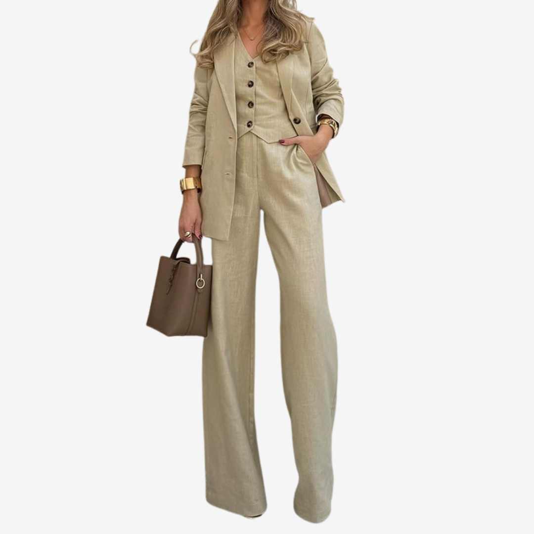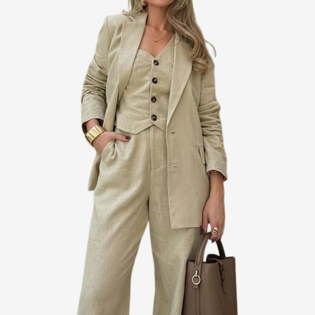 Découvrez Ninette™, l'incarnation du chic parisien. Cet ensemble trois pièces associe un élégant blazer ajusté, un gilet boutonné et un pantalon large taille haute. Ses tons beiges doux rehaussent son style intemporel, tandis que son tissu léger épouse la silhouette pour une sophistication décontractée. Polyvalent pour les réunions d'affaires, les brunchs élégants ou les balades en ville, ce costume s'adapte à votre journée : il vous suffit de changer de chaussures et d'accessoires.