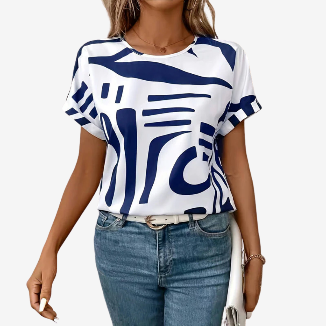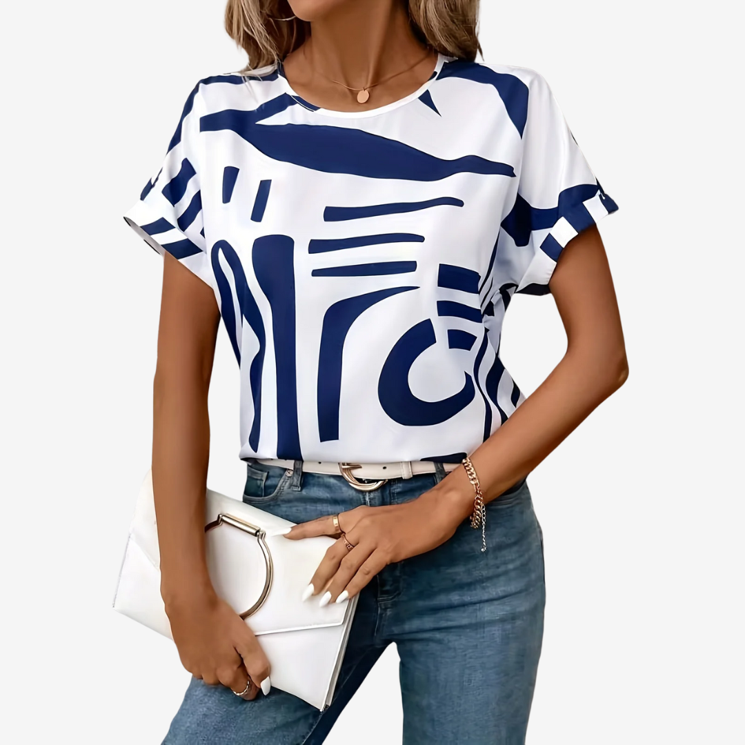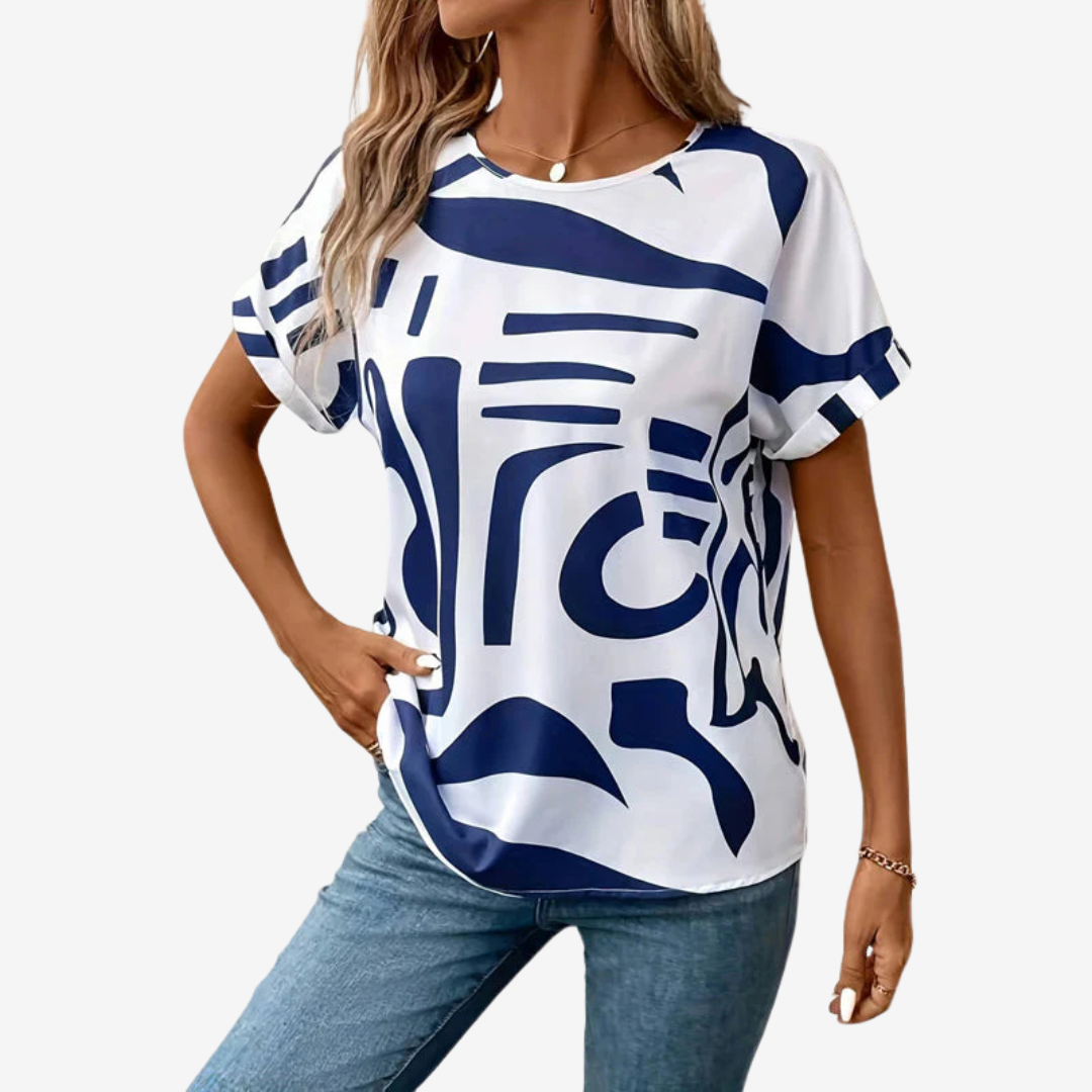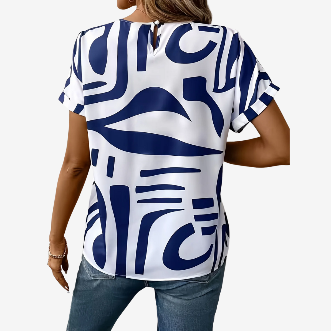 Apportez une touche artistique à votre garde-robe quotidienne avec la blouse Valeska™, une pièce audacieuse et décontractée alliant confort et design accrocheur. Ornée d'un imprimé bleu marine abstrait unique sur fond blanc immaculé, cette chemise à manches courtes apporte une touche moderne au chic décontracté.